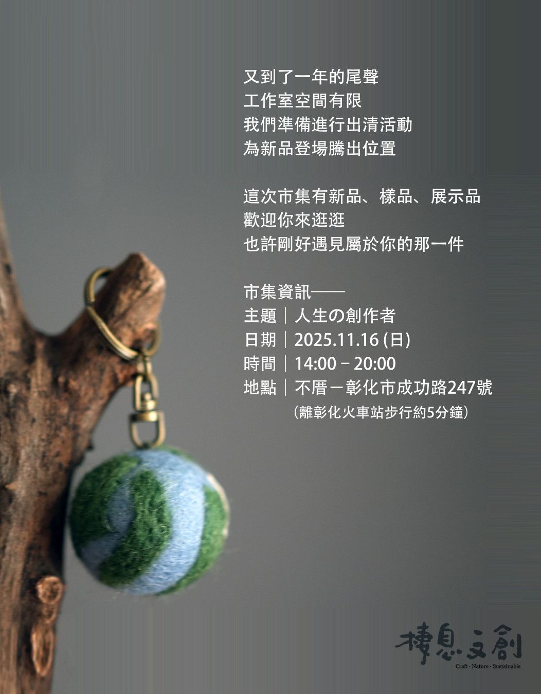 又到了一年的尾聲工作室空間有限我們準備進行出清活動為新品登場騰出位置 這次市集有新品、樣品、展示品歡迎你來逛逛也許剛好遇見屬於你的那一件 市集資訊—— 主題|人生の創作者 日期|2025.11.16 (日) 時間|14:00–20:00 地點|不厝-彰化市成功路247號 (離彰化火車站步行約5分鐘)