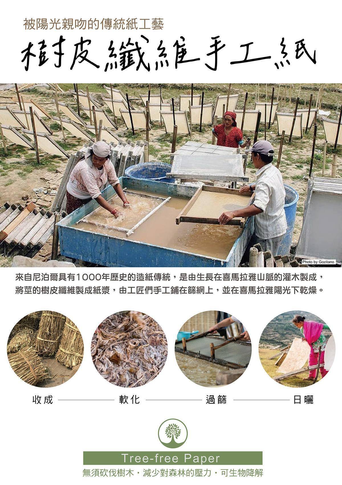 「Lokta 樹皮纖維紙」源自喜馬拉雅山區農莊,由當地農民與家庭手工業以傳統工法製作而成。長久以來,Lokta 被用於書寫神聖文本,數百年來一直是尼泊爾工匠的重要媒材,這份珍貴的造紙傳統延續至今。製作過程不傷害自然植被,有助於減少森林砍伐,也讓生計與土地得以共存。